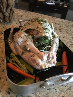 We used a roasting pan to cook the bird. Before putting in the pan loosen the skin to add the following herb blend: