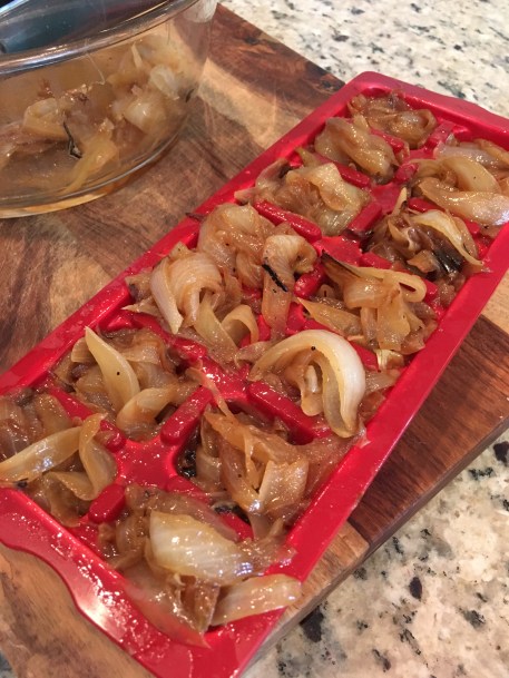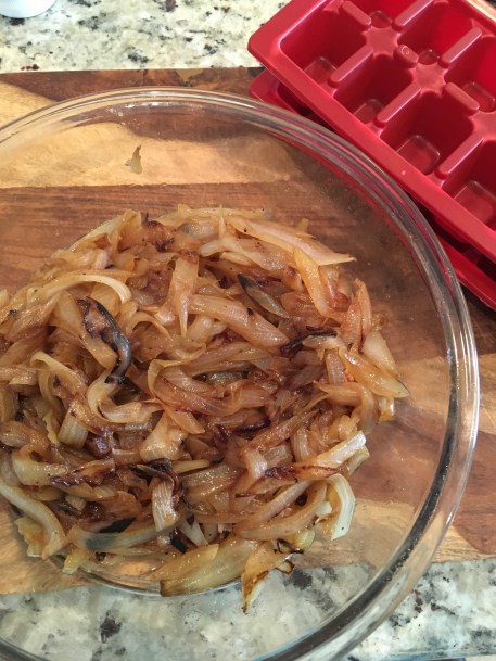 Start with melting the butter in the skillet. Add the sliced onions and stir, stir, stir until they reach the desired color and texture. I added a pinch of kosher salt and black pepper. I kept the stove top on Medium and stirred the onions A Lot! I took them off the heat after about 30-35 minutes. I then put them in a plastic ice tray and popped them in the freezer. This will be a great flavor and time saver for weeknight meals. PS, I also do the ice cube trick for gravy and red wine 🙂